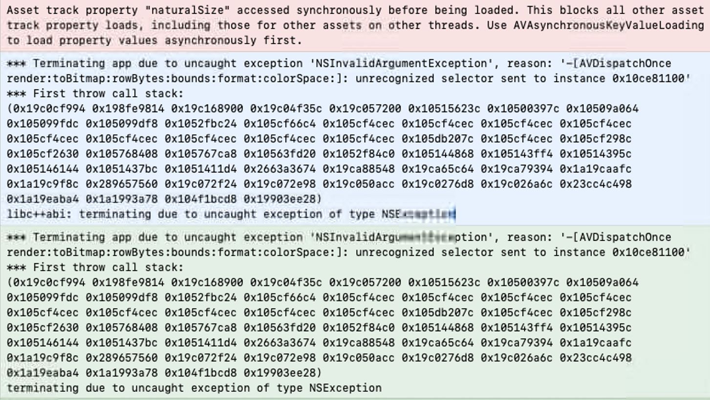 Main thread blocked by synchronous property query on not-yet-loaded property (NaturalSize) for HTTP(S) asset. This could have been a problem if this asset were being read from a slow network. *** Terminating app due to uncaught exception 'NSInvalidArgumentException', reason: '-[__NSSingleObjectArrayI render:toBitmap:rowBytes:bounds:format:colorSpace:]: unrecognized selector sent to instance 0x300633400' *** First throw call stack: (0x19ef68f20 0x196e172b8 0x19f072480 0x19ef05fb4 0x19ef058d0 0x10297b8b4 0x102815fe0 0x1028b6280 0x1028b61f8 0x1028b600c 0x102b26978 0x10359a6c4 0x103598cec 0x103598cec 0x103598cec 0x103598cec 0x103598cec 0x103598cec 0x103598cec 0x103598cec 0x103598cec 0x10365607c 0x103598cec 0x10359698c 0x103596630 0x102fb1e00 0x102fb16a0 0x102e84378 0x102b231a0 0x102968d5c 0x102968374 0x102967cdc 0x10296a840 0x102967b3c 0x1029653a0 0x1027179a8 0x2452bfc68 0x1a0628dc4 0x1a06270e8 0x1a0627a70 0x19ef39d68 0x19ef39ca4 0x19ef39bc4 0x19ef38a0c 0x19ef37cd8 0x1e39851a8 0x1a1571ae8 0x1a1625d98 0x102725514 0x1c270f154) libc++abi: terminating due to uncaught exception of type NSException