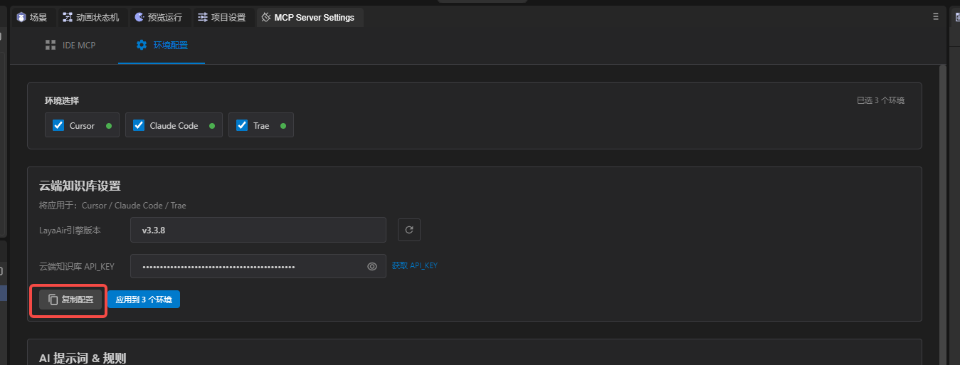 您可以在MCP面板中复制相关配置,并参考配置的格式,在您使用的AI编码工具中配置MCP服务